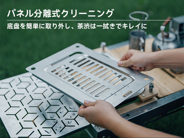 パネルが分離できる構造になっているため、屋外でついた茶渦も水をかけるだけで簡単に一掃でき、家庭で使用する場合も煩雑な手順は不要です。手軽に清潔を保つことができます。
