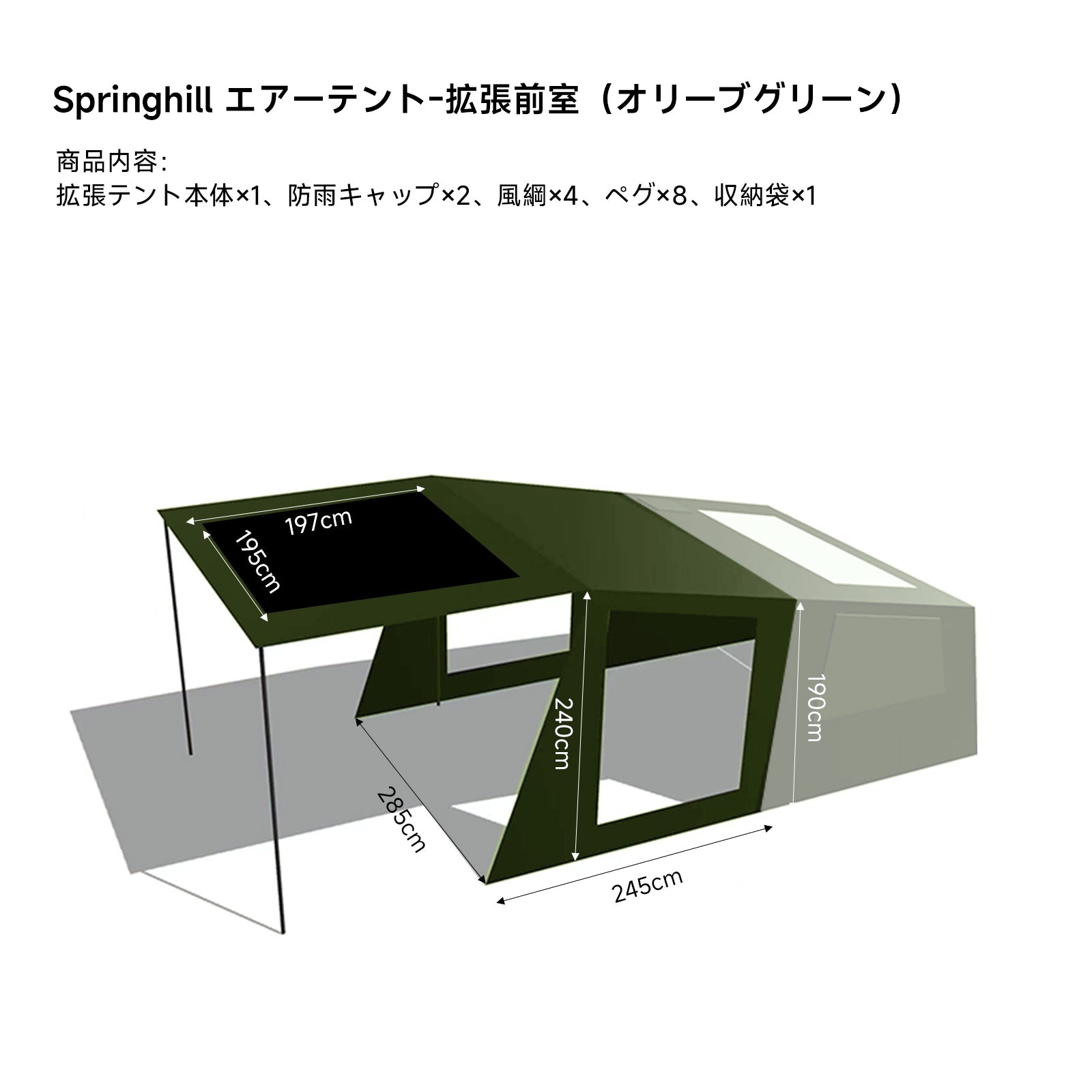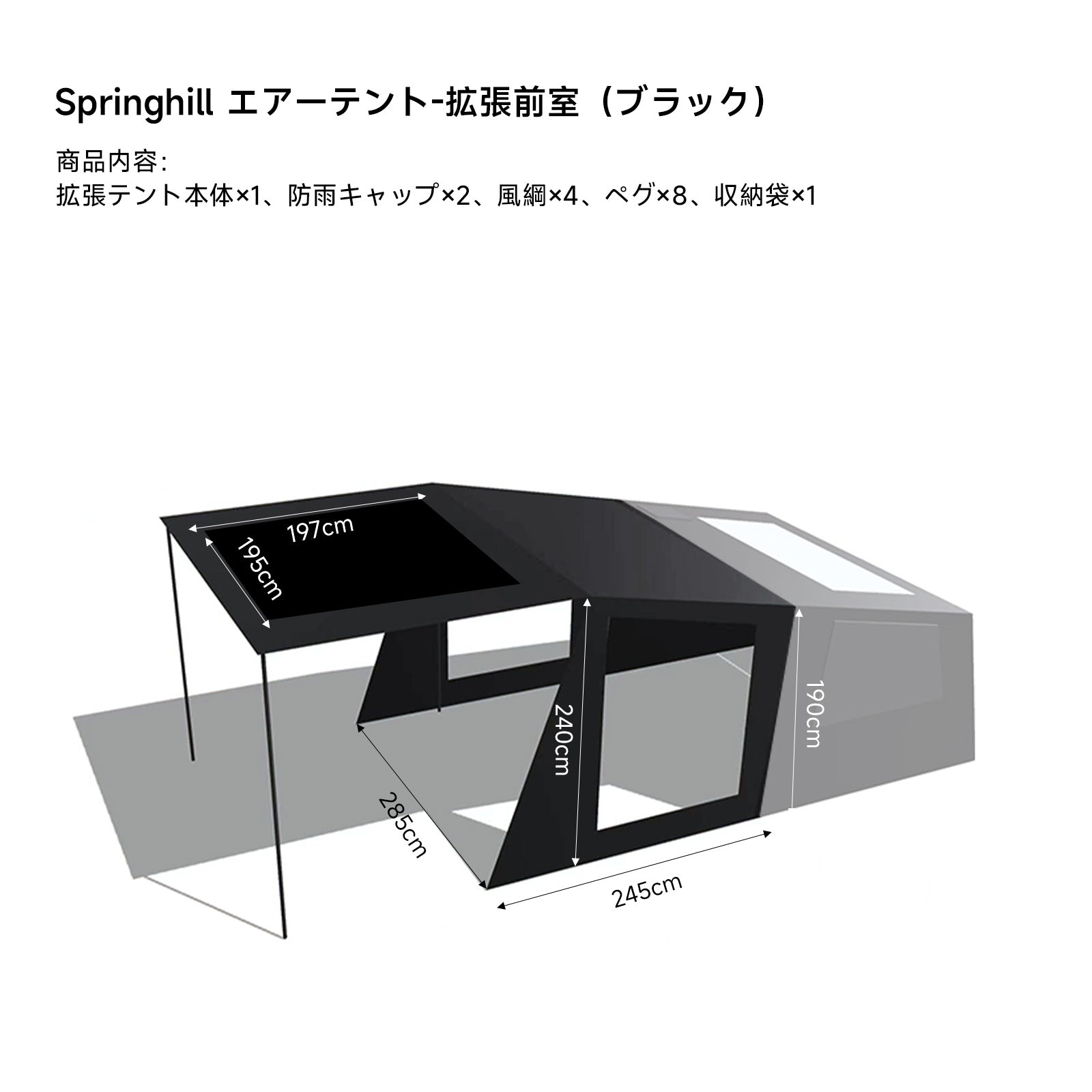 A4:このテントは、4人以上が快適に過ごせる広さを提供します。約7㎡のメインテントに加え、拡張前室を接続することで、さらに広い約14㎡の空間を実現できます。